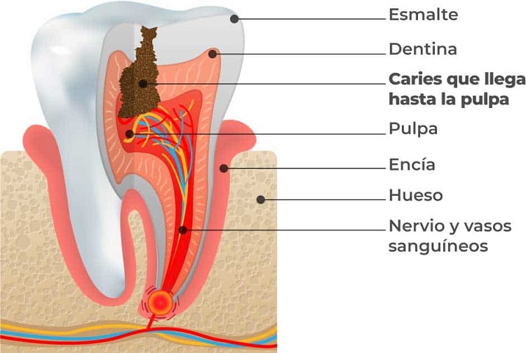 - La caries, ésta provoca una desmineralización del tejido dental y con ello una pérdida de parte de la estructura del diente con lo que la pulpa se queda desprotegida. Esto normalmente provoca alta sensibilidad la temperatura y finalmente dolor.